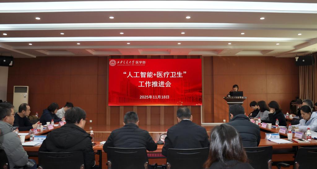 2025年11月18日,医学部召开“人工智能+医疗卫生”工作推进会。三所附属医院主管医疗相关领导,医务部、信息网络部、护理部、病理科、影像科主任,“智慧数字技术赋能临床重点专科能力提升”各项目负责人(代表),“互联网+护理服务”项目相关负责人,新疆及洛阳区域医疗中心相关领导及负责人等近80人通过线上线下相结合方式参会,会议由医学部副主任孟晓军主持。